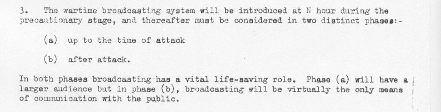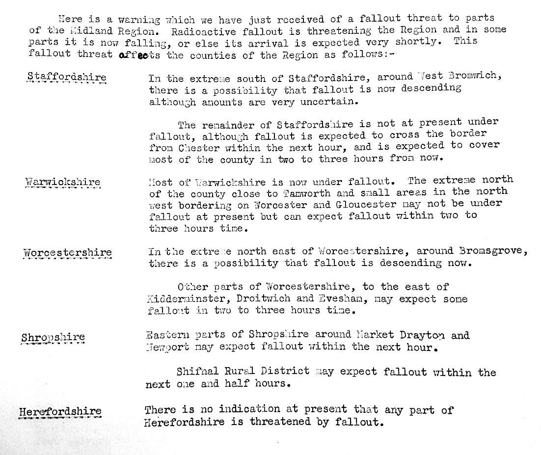 "This is the Wartime Broadcasting Service. This country has been attacked with nuclear weapons. Communications have been severely disrupted, and the number of casualties and the extent of the damage are not yet known. We shall bring you further information as soon as possible. Meanwhile, stay tuned to this wavelength, stay calm and stay in your own homes."